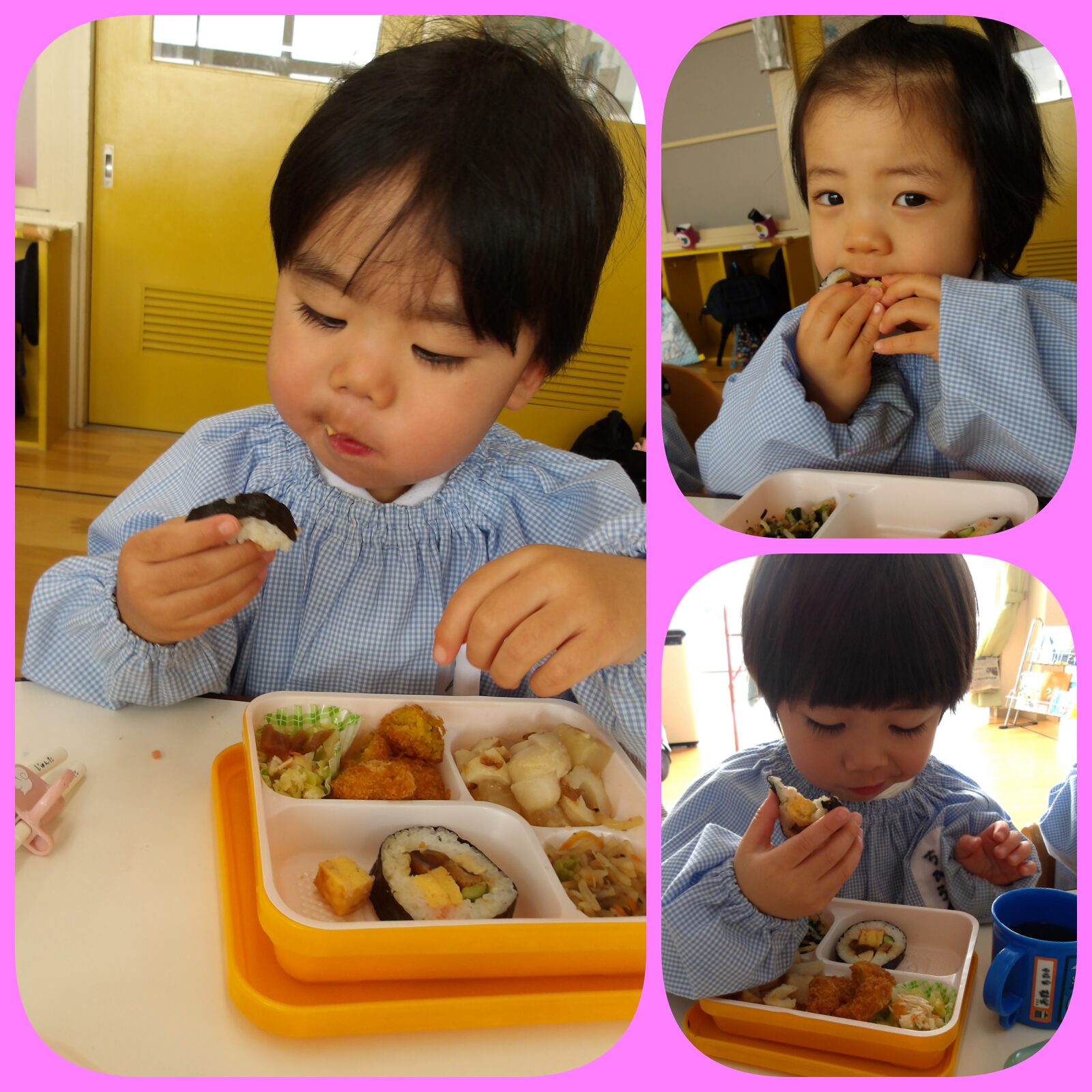 昼食は恵方巻。「おいしいねー」と喜んで食べていました。