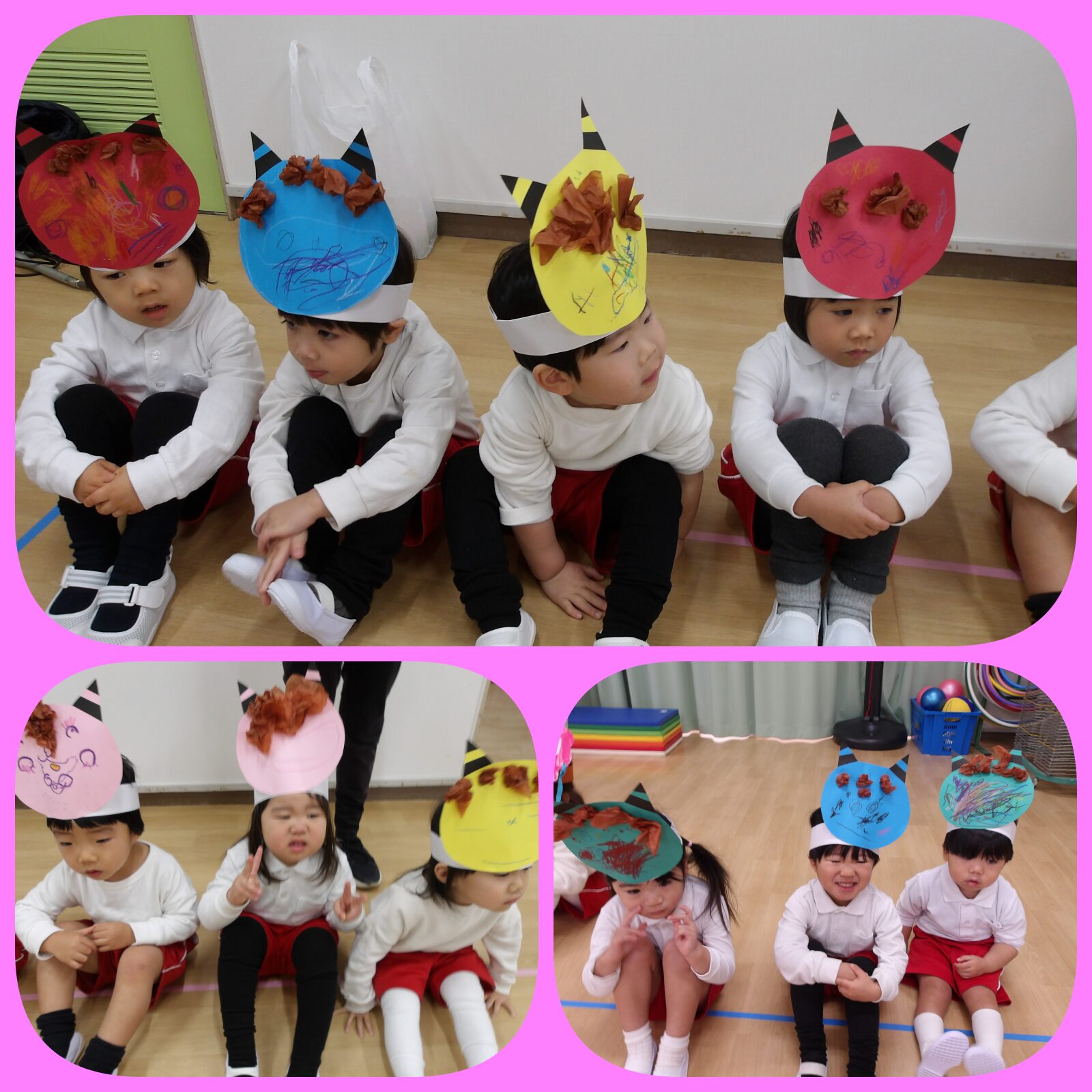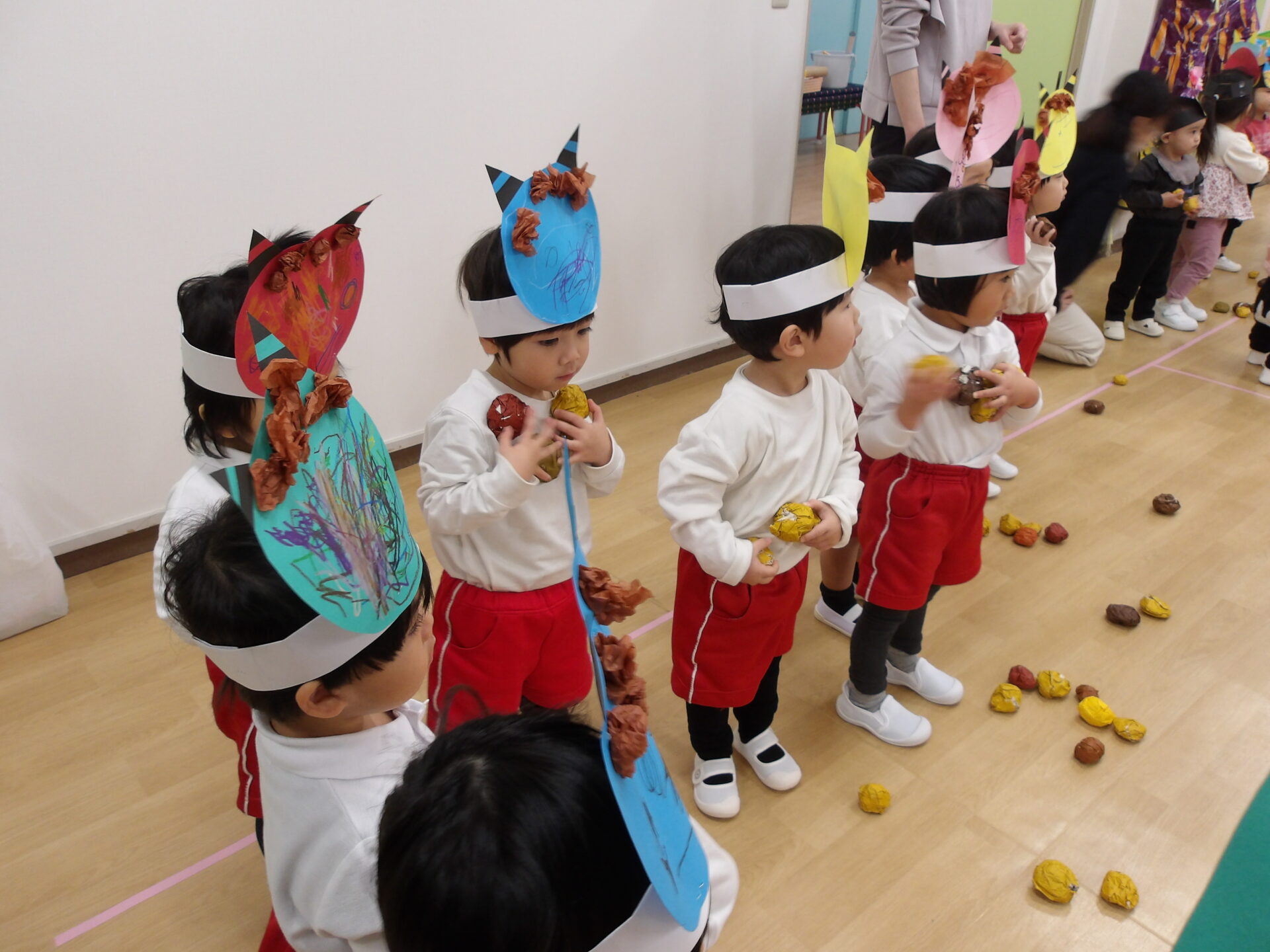 2月の最初は豆まき会。手作りのお面をかぶって楽しみにしていました。