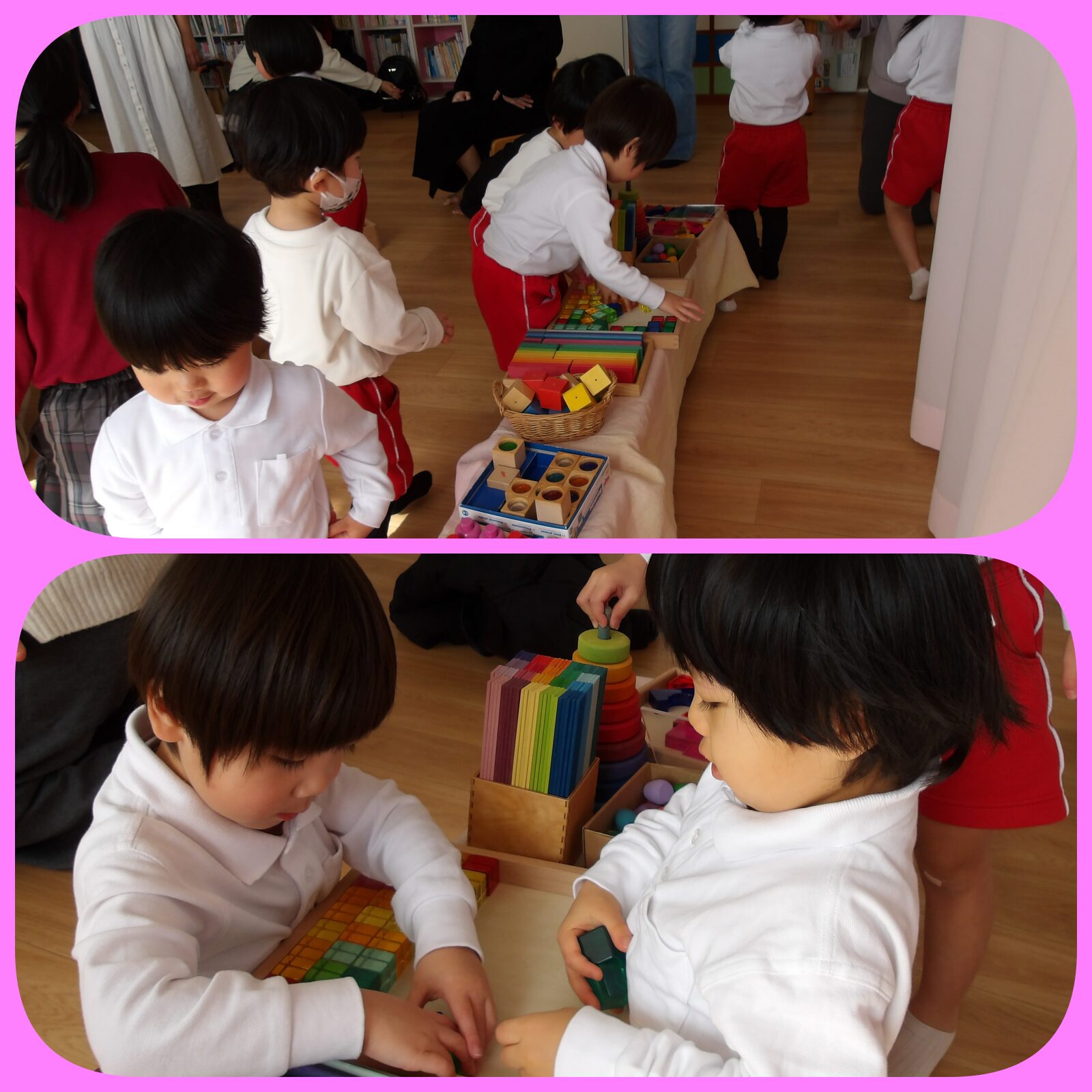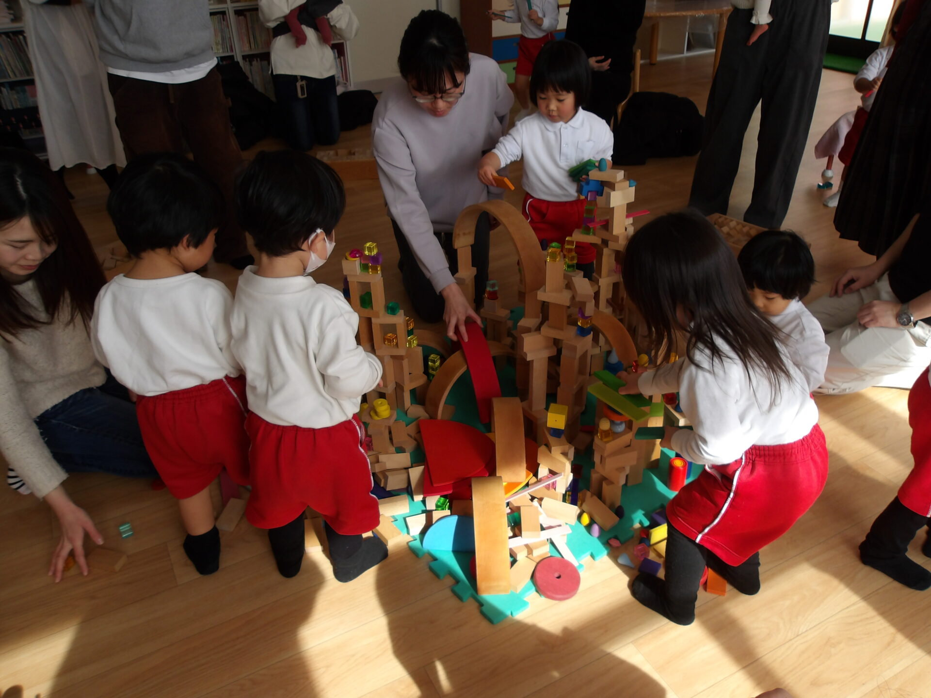 お部屋にはカラフルな積み木が沢山置いてあり、みんな興味津々でしたね。