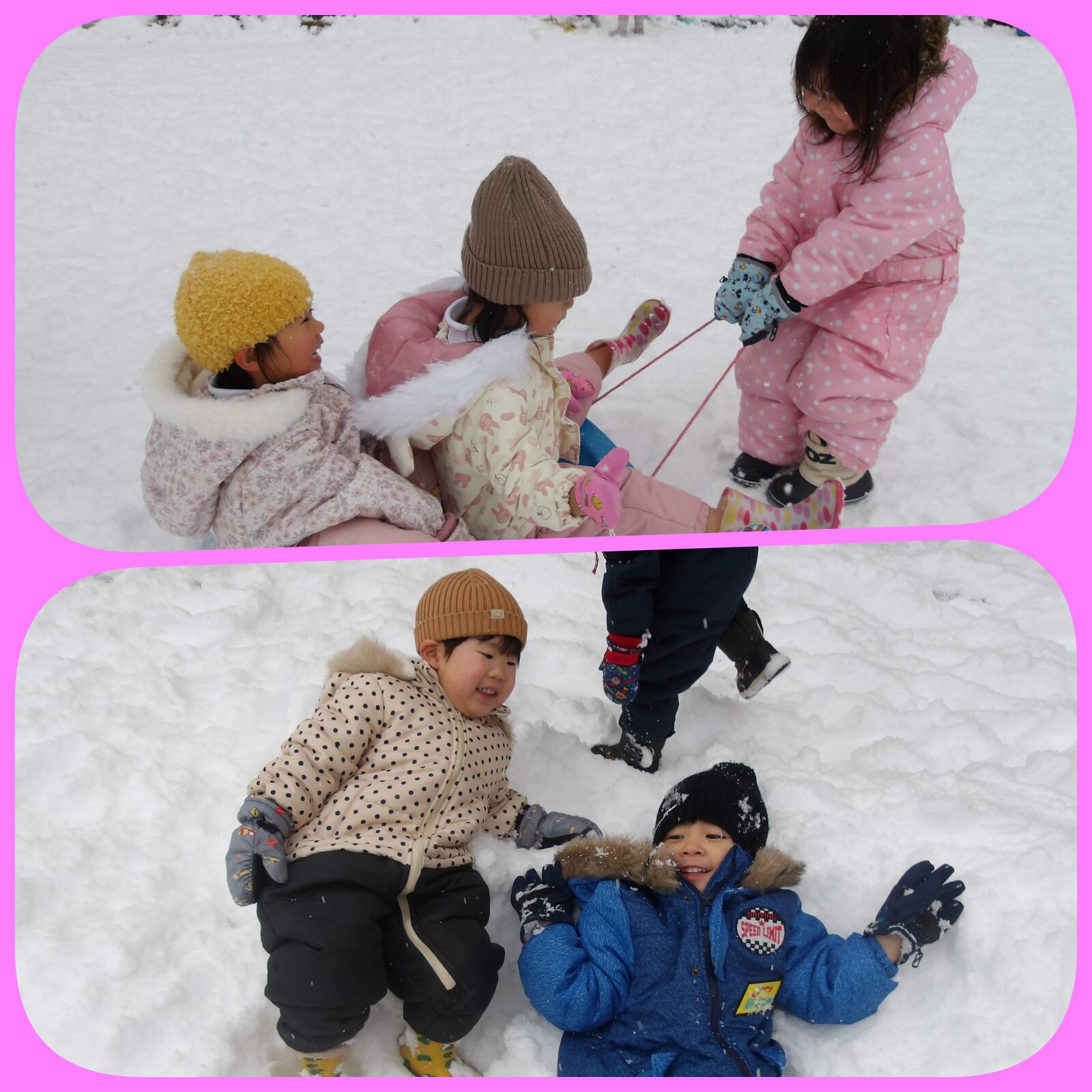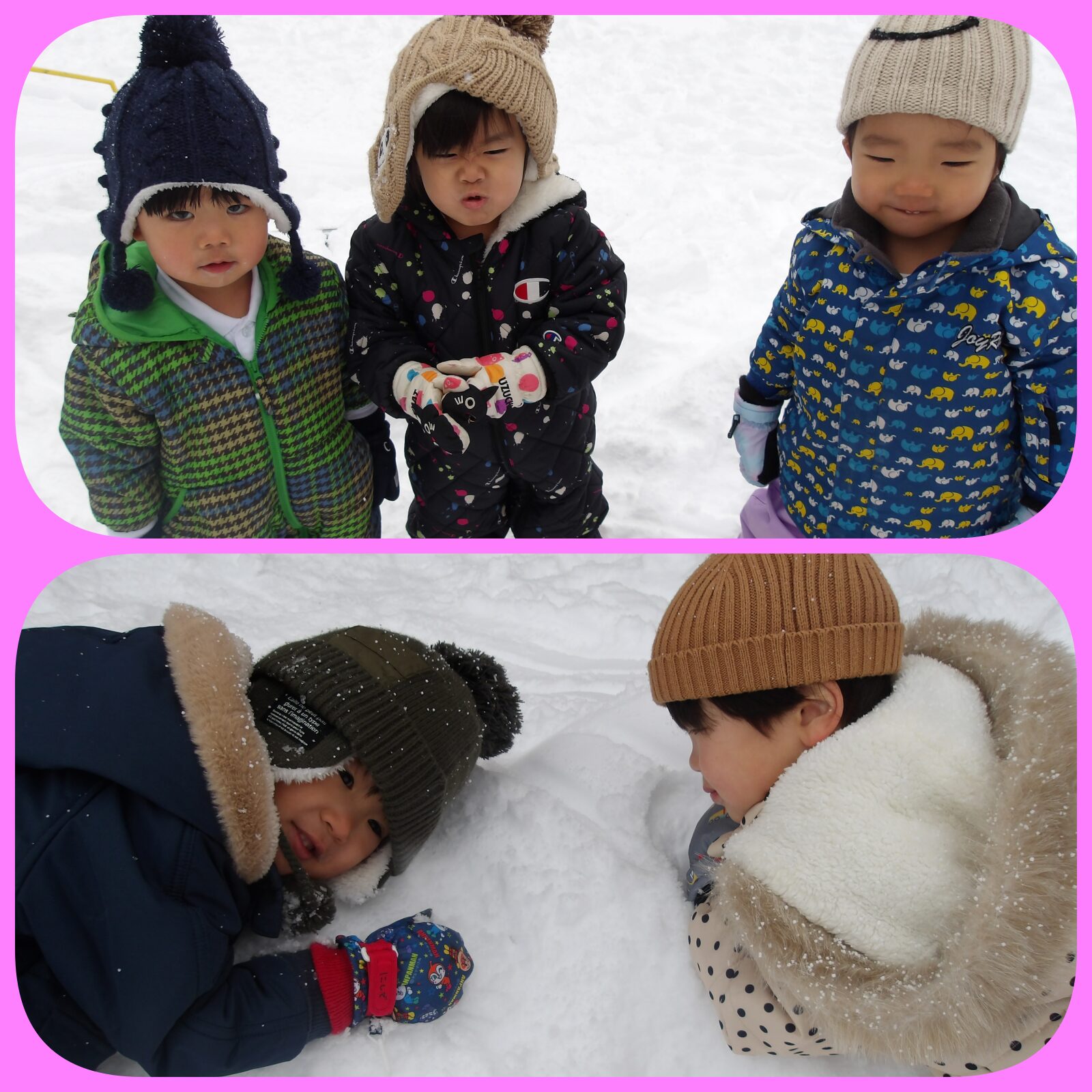 そして、みんな楽しみにしてた雪⛄が降りました。毎日窓を見て、「今日も雪遊びする?」とワクワクしています🧡スキーウエアに着替えて沢山遊びました。