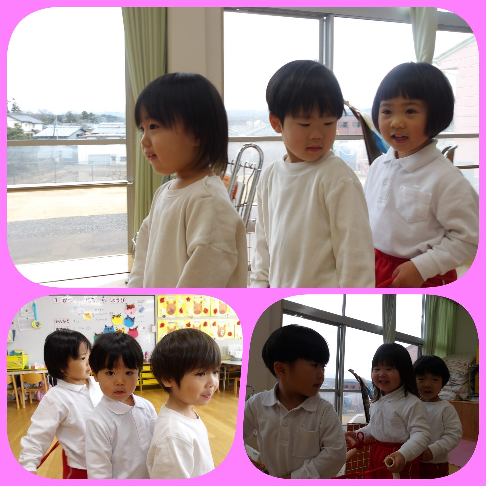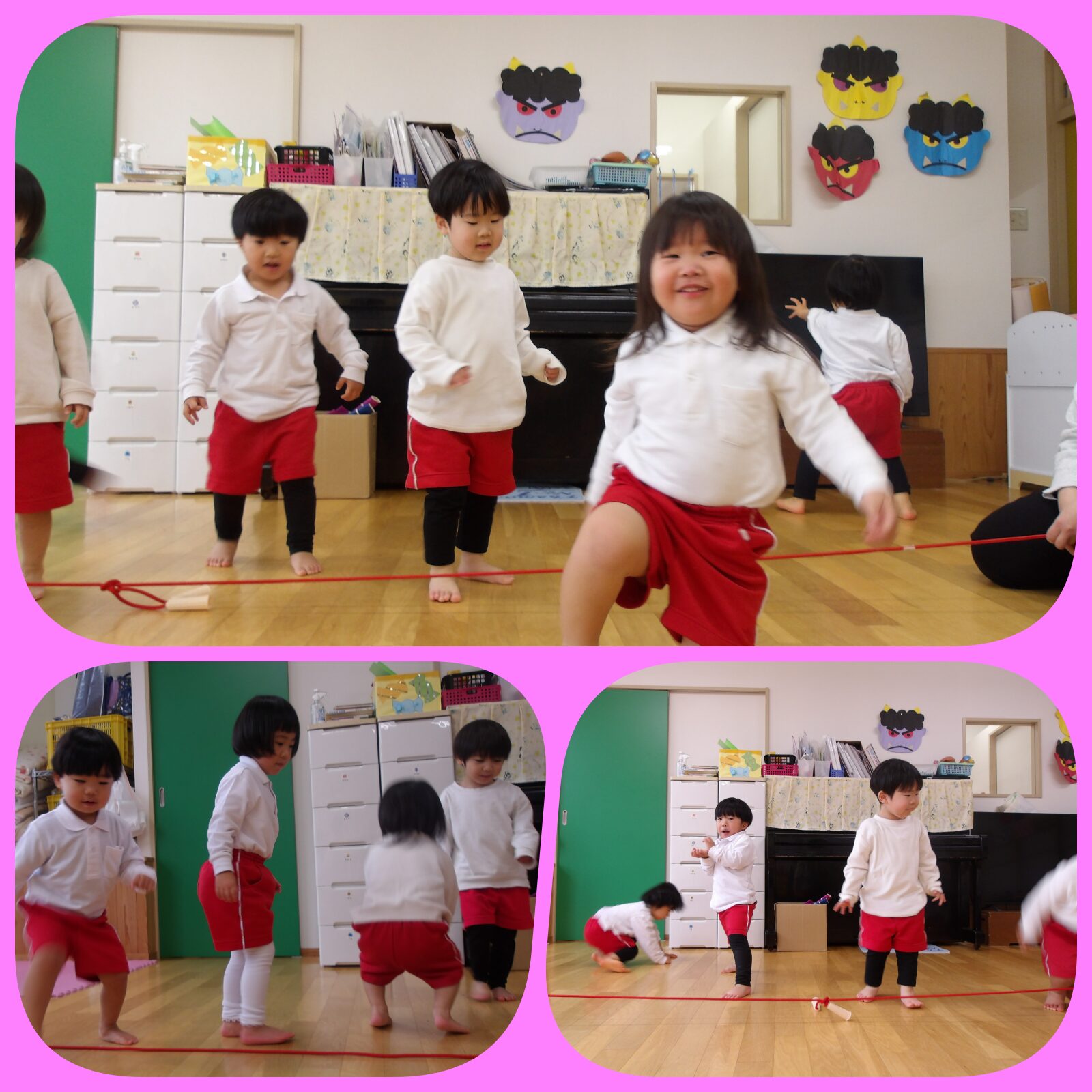 お部屋では縄跳び遊びもしました。縄をくぐったり、ジャンプしたりと、縄に沢山触れ合って遊びました。