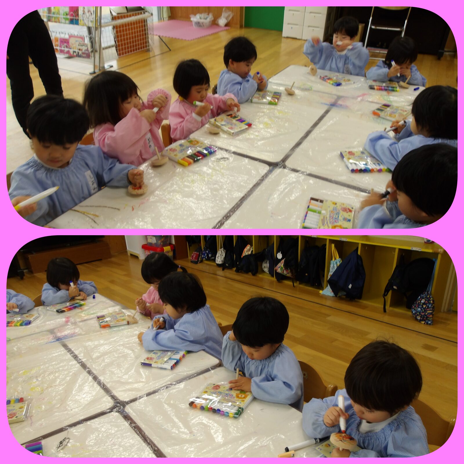 みんなでコマ回しをしました!最初はコマにカラーペンで好きな色に塗りました🩷みんなお気に入りのコマが完成しました。
