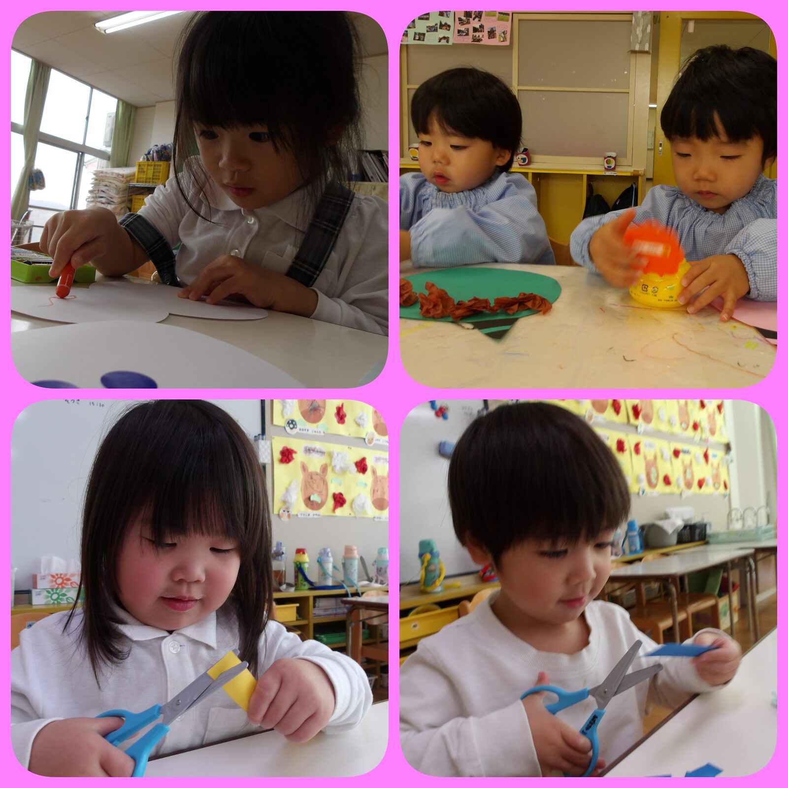 制作では雪だるまを作ったり、糊やハサミにも挑戦しました。ハサミはみんなドキドキしていたけど、上手に切れました😊