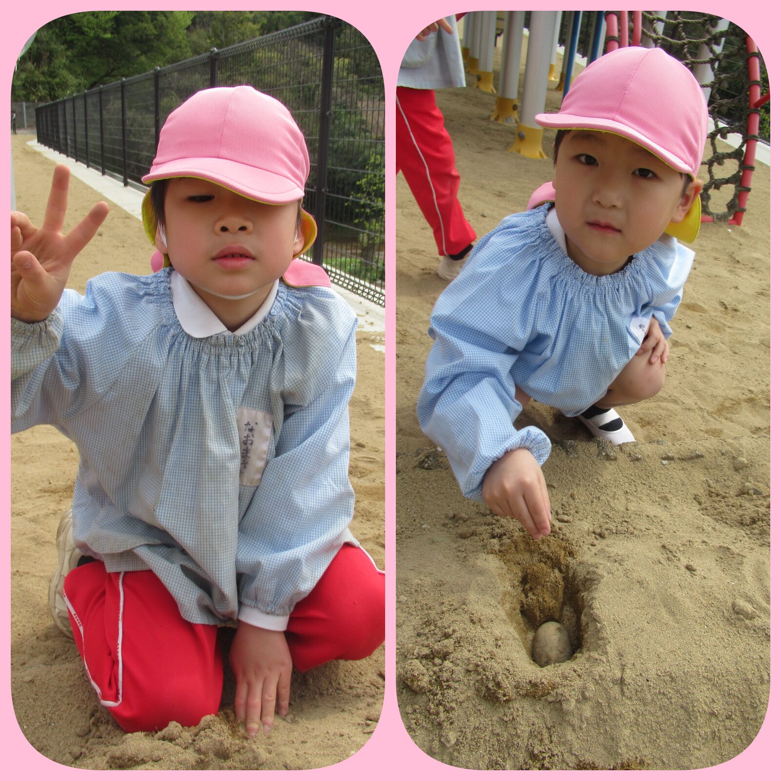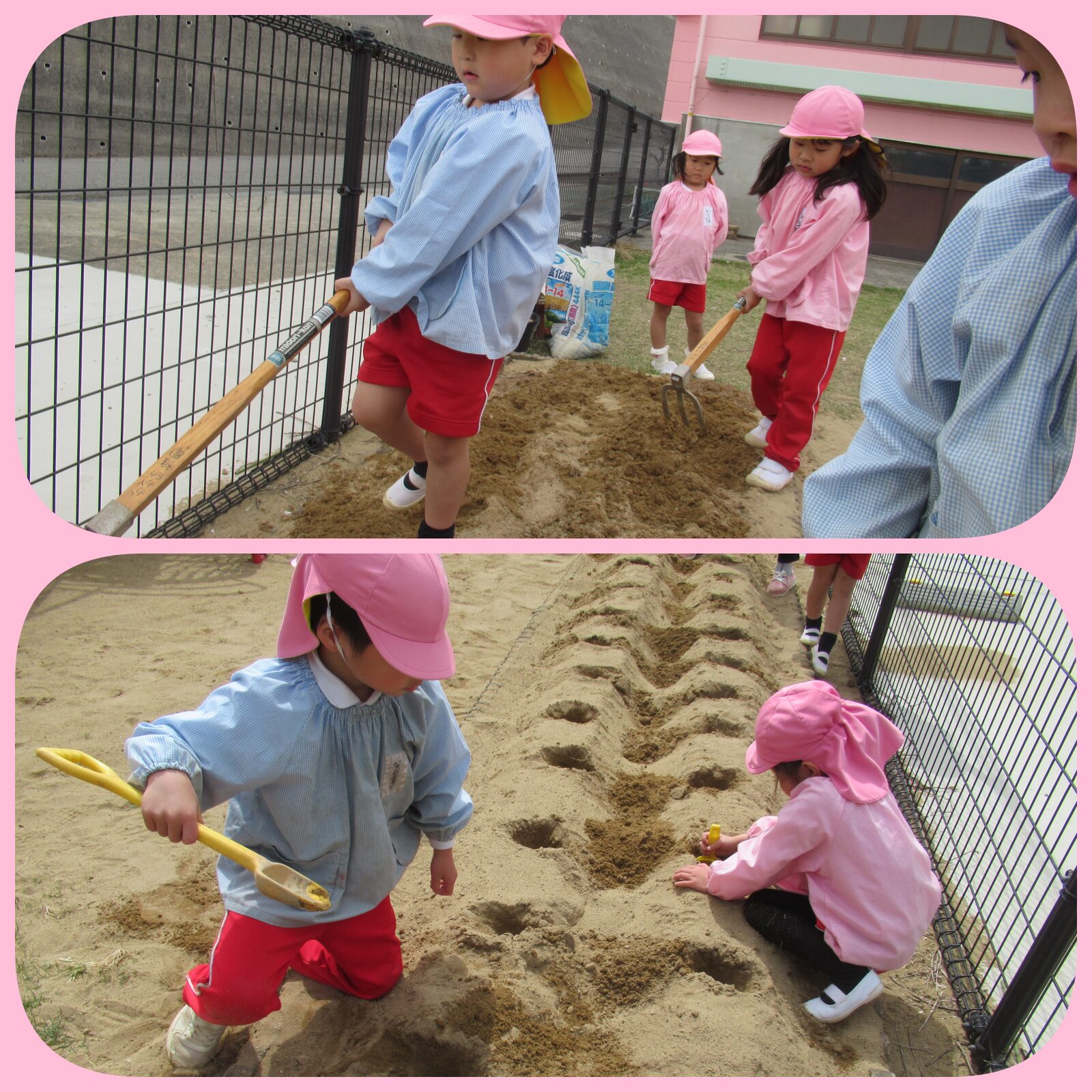 天気のいい日にジャガイモを植えました。穴からみんなで掘って頑張りました。大きくな~れ!