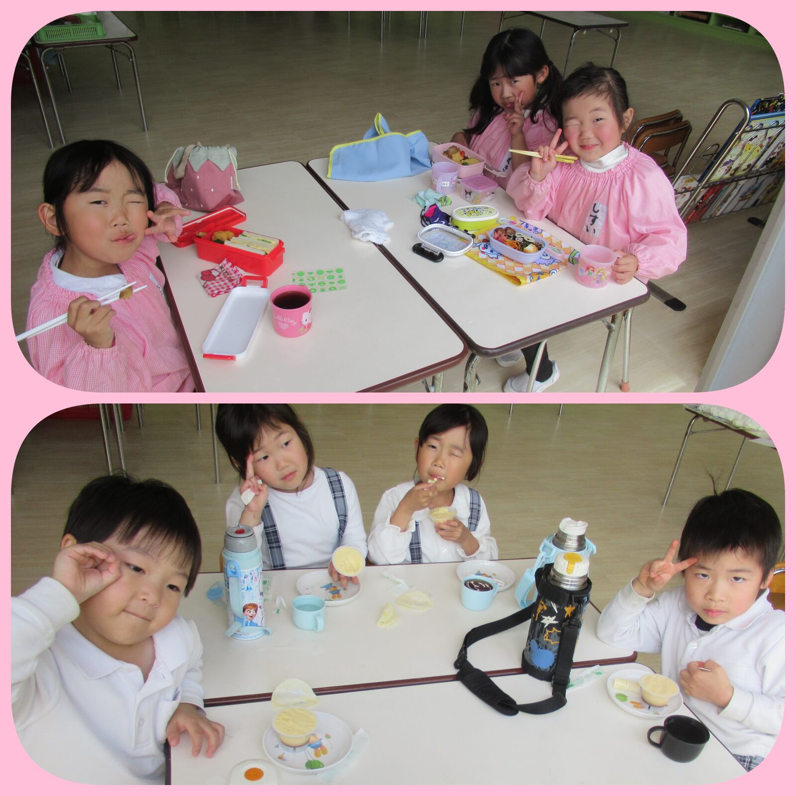 沢山遊んだら美味しいお弁当。お天気のいい日は外の景色を見ながら食べました。みんなで食べると美味しいね💛