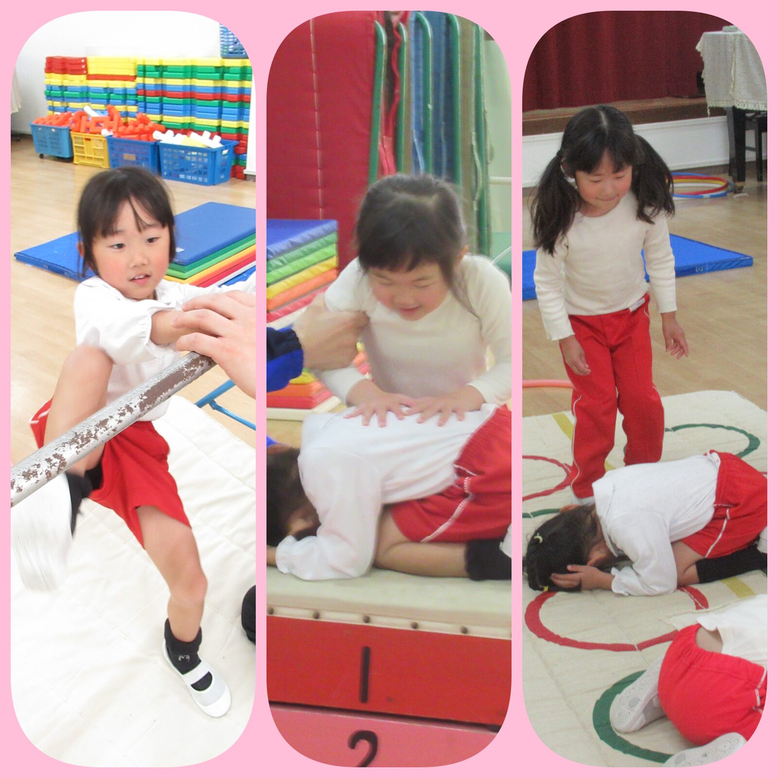 さくら組になって初めての体験教室も始まりました。最初は体育教室。鉄棒や馬飛びに挑戦しました。