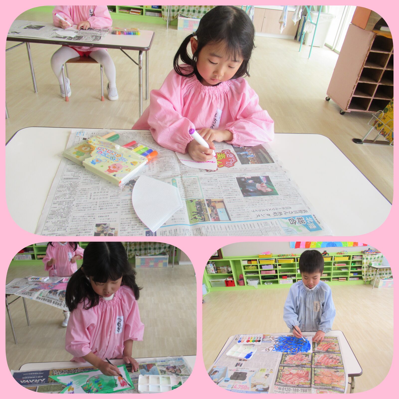 お部屋では鯉のぼりを作りました🎏絵の具を使ったり、コーヒーフィルターを使い、それぞれの鯉のぼりを作りました。