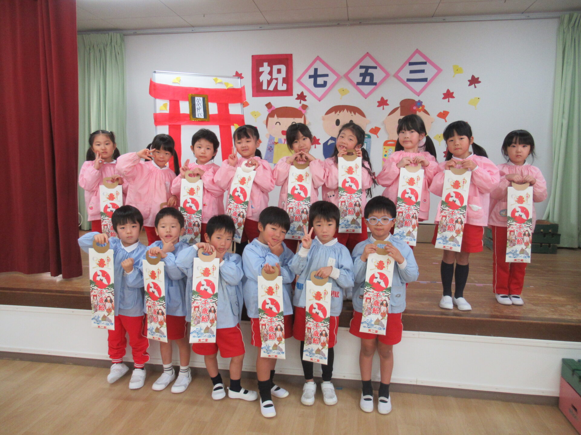 七五三の会に参加し、千歳飴をもらって記念撮影😊 これからも15人みんなが元気に大きくなりますように😌✨